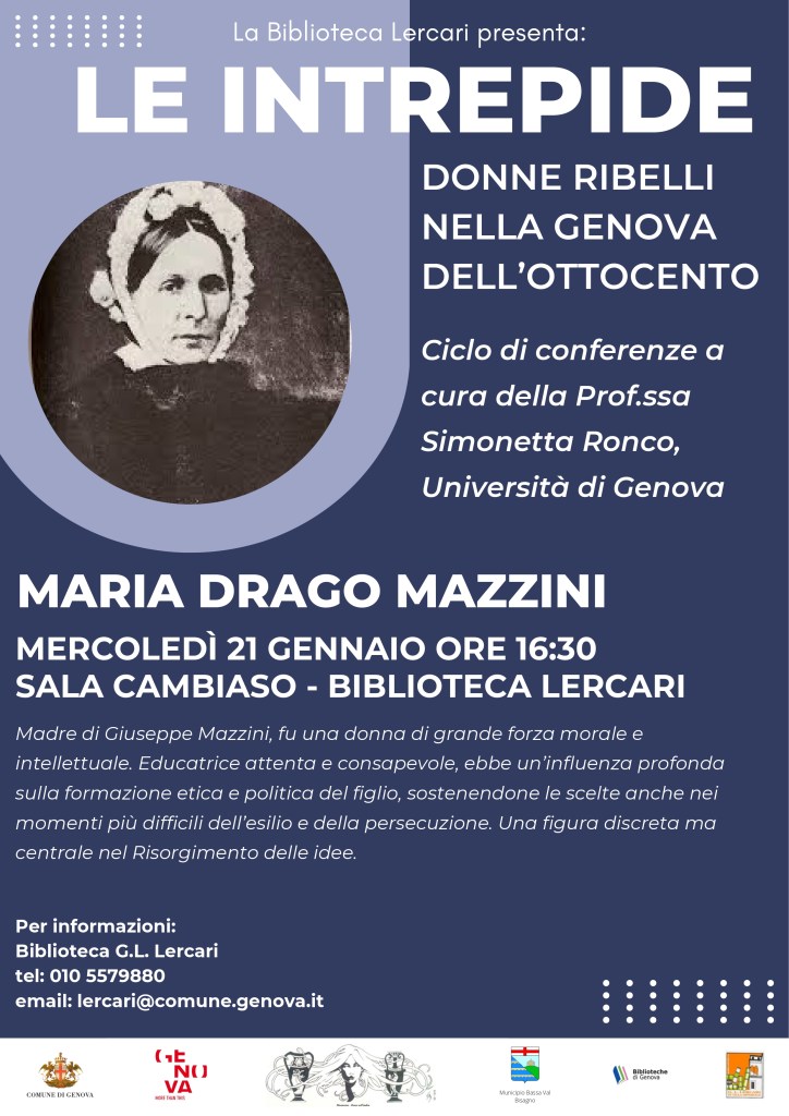 Il 21 gennaio 2026 ho tenuto una prima conferenza su alcune donne del Risorgimento Italiano alla biblioteca Lercari di Genova, sita nella suggestiva Villa Imperiale.