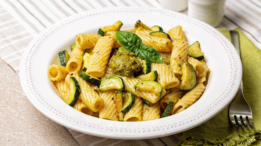 La pasta accoglie il pesto con una passività amorosa, lasciandosi avvolgere da quella crema verde brillante, granulosa di pinoli e sapida di formaggio. Poi arrivano le zucchine, tagliate a rondelle sottili, arrese alla padella finché non sono diventate tenere e dorate. Non sono solo un contorno, ma piccole lune lucide d’olio che aggiungono una nota di morbidezza vegetale, un contrasto delicato alla forza aromatica della salsa ligure. Ogni boccone è un equilibrio precario tra la freschezza dell’erba e la dolcezza dell’orto, un rito che si consuma lentamente, mentre fuori il mondo rallenta.
